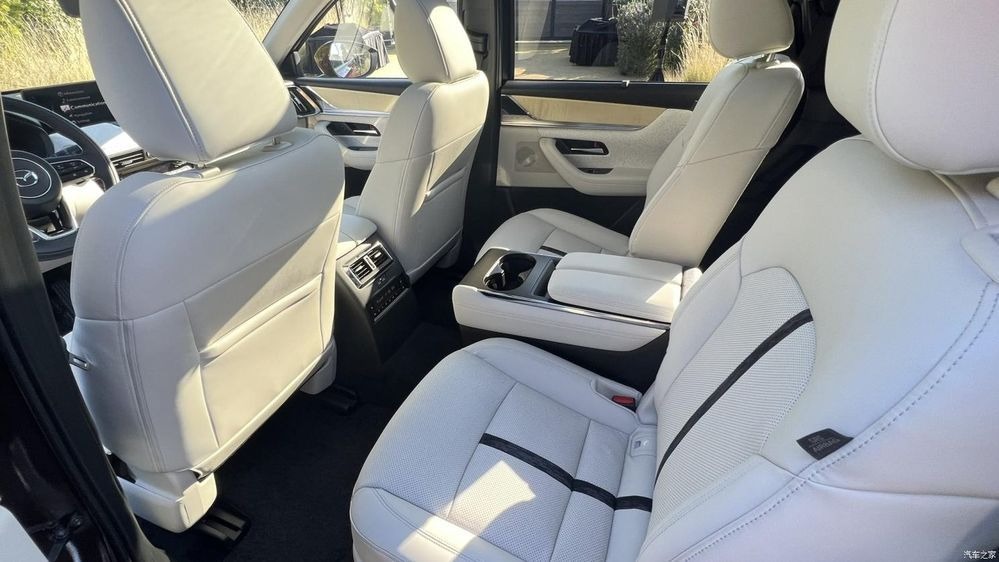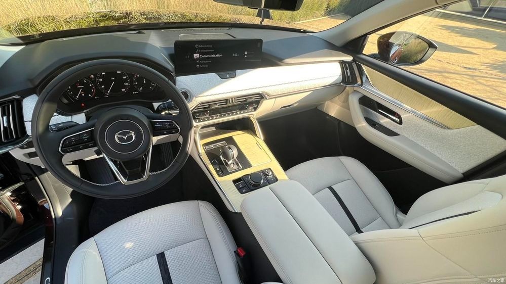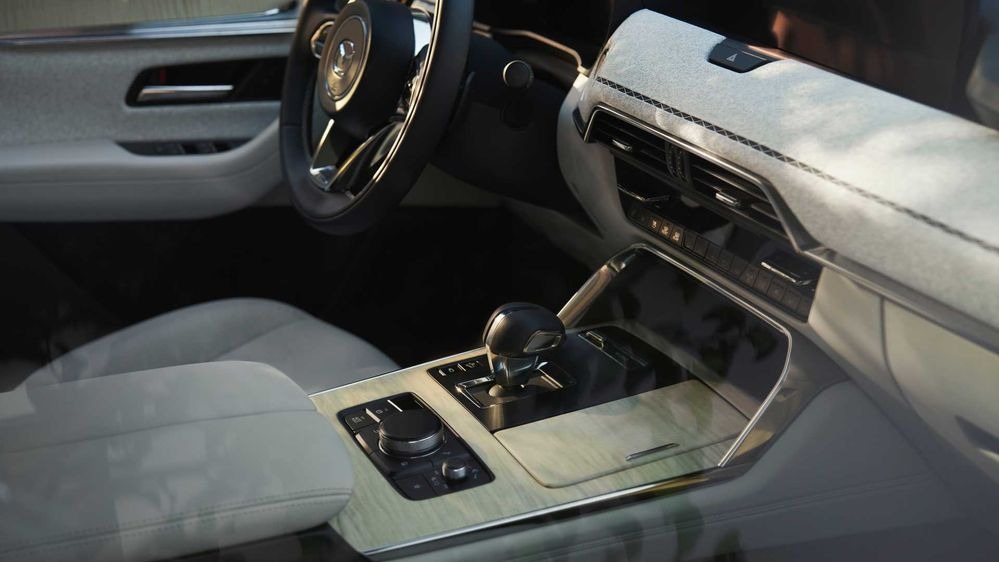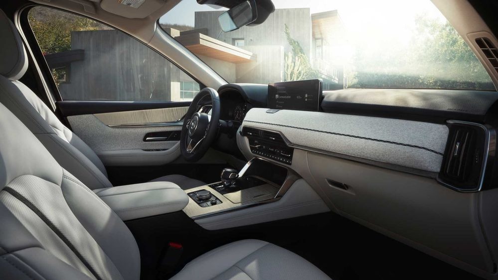 ส่วนภายในห้องโดยสาร แน่นอนว่า ธีมการออกแบบจะเป็นสไตล์ KODO ของ Mazda ที่แสดงถึงความมีชีวิตชีวา สวยงามเรียบง่ายได้สัดส่วนแบบมินิมอล ทั้งเรื่องของแสงหรือวัสดุธรรมชาติให้ความหรูหราเป็นระเบียบ ไม่ว่าจะเป็น เบาะหนัง Nappa แผงหน้าปัด Full LCD จอแสดงผลกลางขนาด 12.3 นิ้ว พร้อมจอภาพ See-Through View เพื่อช่วยในการจอดรถ ส่วนจอแสดงผลควบคุมส่วนกลาง มี 2 ขนาด คือ 10.25 นิ้ว และ 12.3 นิ้ว รองรับการเชื่อมต่อ Apple Car Play แบบไร้สาย (รวมทั้ง Android Auto) ผ่านปุ่มควบคุมอัจฉริยะ Center Commander เพิ่มความบันเทิงด้วยชุดลำโพง BOSE 12 จุด ระบบปรับอากาศควบคุมสภาพอากาศ 3 แถว ยิ่งไปกว่านั้น แถวหลังมีประตูท้ายระบบไฟฟ้า และมีพอร์ต USB Type-C มีให้กับผู้โดยสารทุกที่นั่ง